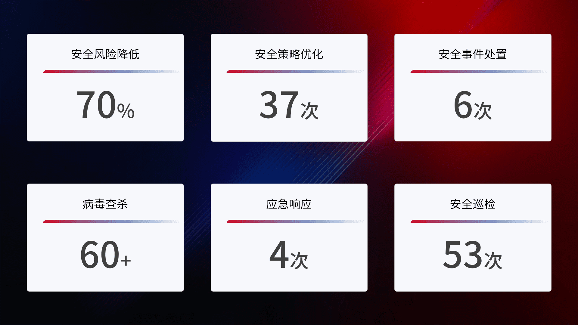 提供全面的安全事件报告体系,,包括处置报告、、、周报、、季度和年度总结,,,,结合持续监控,,帮助客户深入了解网络安全状况。。。。