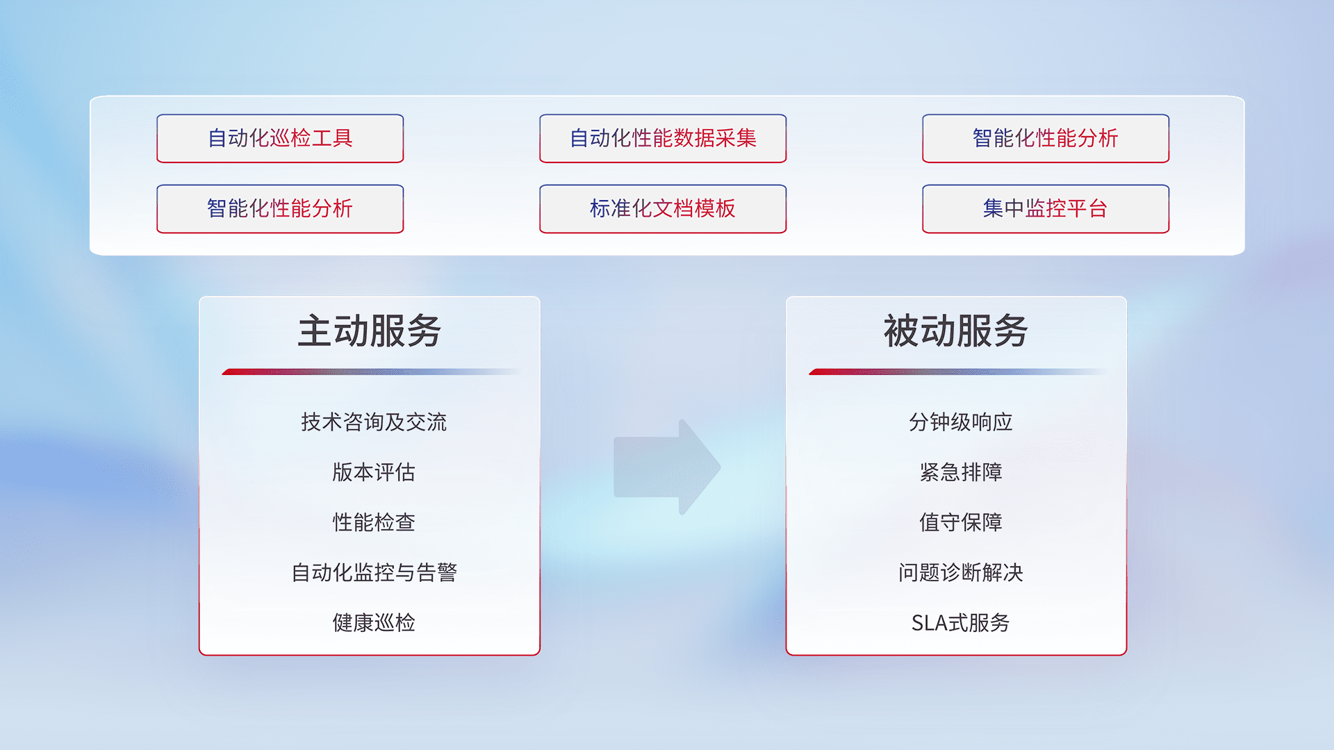 智能化工具和标准化文档,,,保障服务质量,,,提供主动服务(包含技术咨询、、、、版本评估、、、性能检查、、、自动化监控与告警、、健康巡检)和被动服务包含(分钟级响应、、、、紧急排障、、、值守保障、、、、问题诊断解决、、SLA服务)。。。