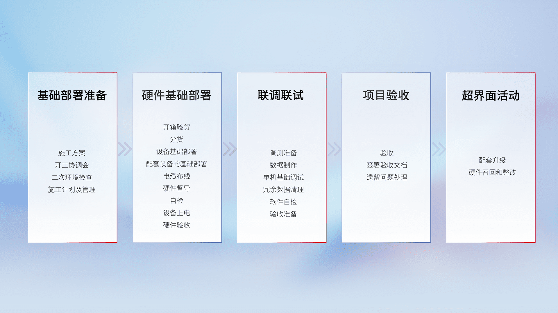 从基础部署准备、、、硬件基础部署、、、联调联试、、、、项目验收、、、越界面活动的全过程可追溯,,保证施工质量和进度。。。