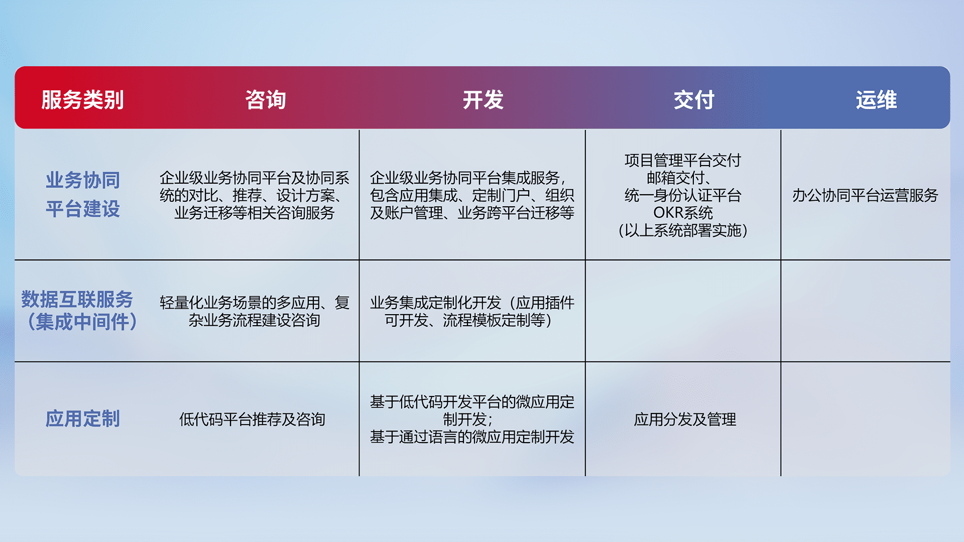 针对钉钉、、企微、、、、IDaas等平台级产品提供产品的规划、、、方案、、交付、、、、定制化开发等服务,,,实现如统一协同办公、、、智能客户服务、、、混合会议管理、、智能数据查询、、、等业务场景,,,,实现数字化转型。。。